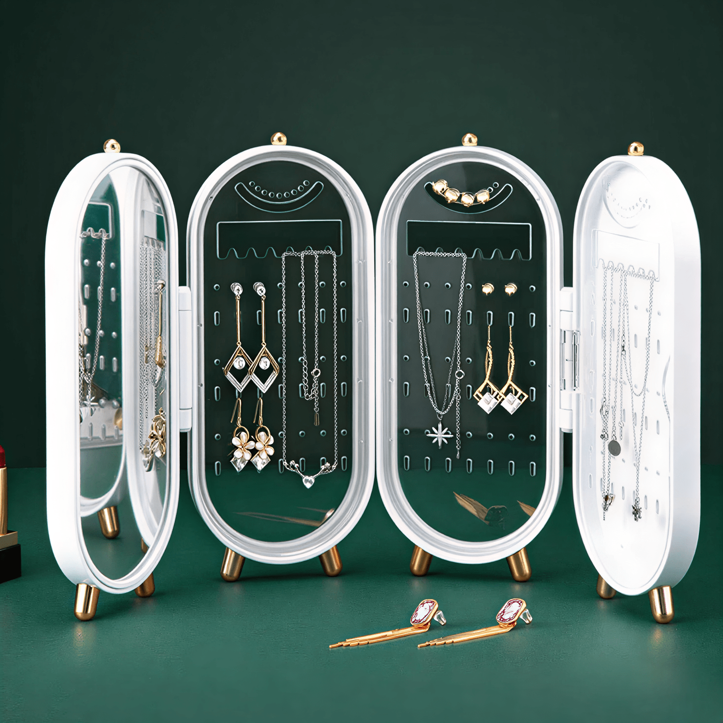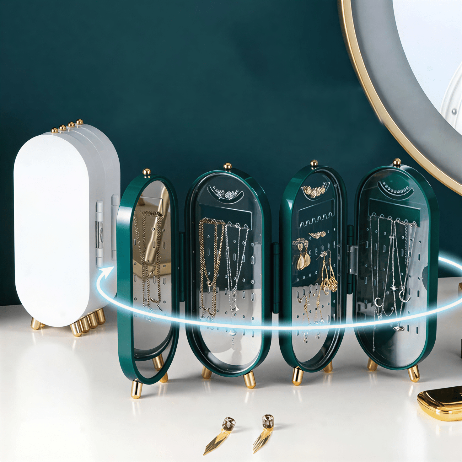 Organize and display your cherished accessories with this elegant Foldable Jewelry Organizer Box. Designed for the modern dresser, this storage solution features a striking emerald green finish and luxurious gold-toned metal feet, instantly elevating your vanity or bedside table.