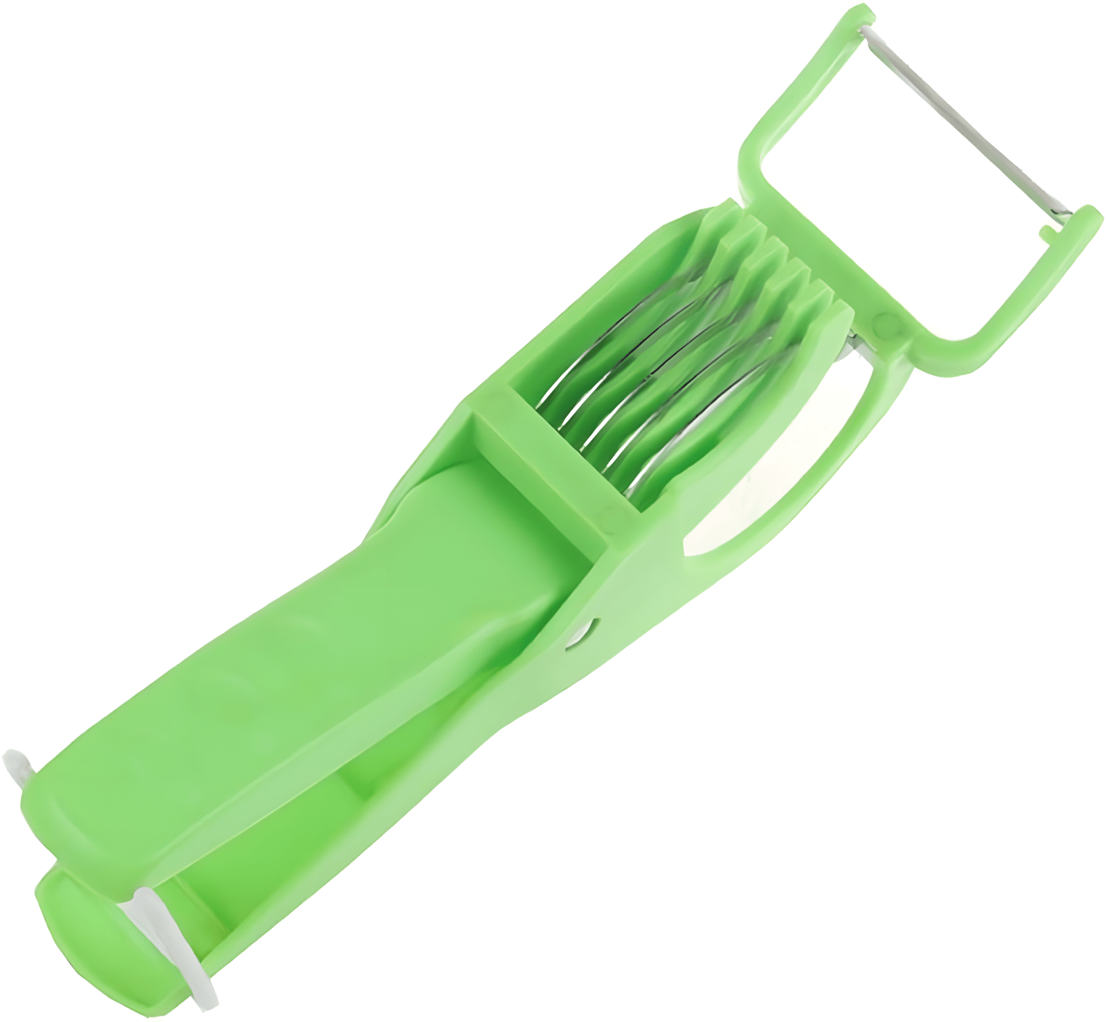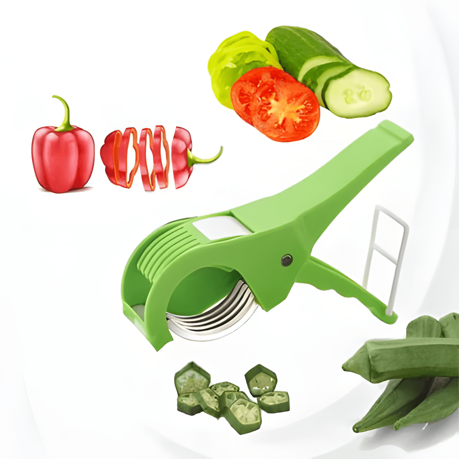 Ergonomic and Safe Design: The cutter features multiple sharp stainless steel blades contained within a durable, food-grade plastic frame (in a vibrant green color). The ergonomic, scissor-like design provides a comfortable grip and leverage, while the integrated safety pusher or cage holds the food securely, keeping your fingers away from the sharp blades.