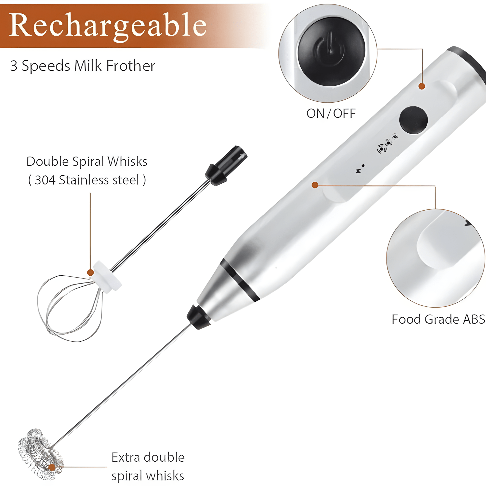 High-Performance & Versatile Design: This frother features a powerful motor that quickly achieves two main functions: frothing and beating. It includes interchangeable whisk heads—typically a double spiral whisk for frothing milk and a balloon whisk for mixing eggs or batters—providing true multi-purpose utility. The stainless steel construction ensures both durability and easy cleaning.